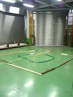 そしてこれが有る物で作った特設コース コンクリに塗装した路面なのでゴムタイヤは全くグリップせずスポンジタイヤで走行 015用は社外から出ているスポンジが有るのですがF-1用は無くホームセンターで購入したスポンジカバーを加工して使ってます それでもかなり滑るので難しいですが楽しいですなぁ |