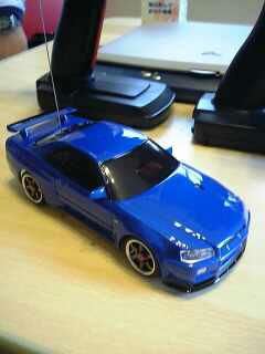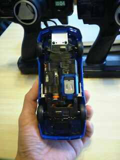 これがAWDの裏側、この大きさによく詰め込まれてるものだと関心します で肝心の走りの方はと言いますとノーマルの付属タイヤでフローリング路面を走るには走りますが巻きが強くタイヤ交換等のセッティングは必要なようです ドリフトマシンにすればかなり遊べるのは間違いないですな 私も早くほしい・・・ |
