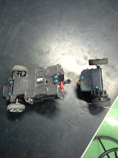 これは毎日一緒に走っている同僚のエスティマ(015) ボディーにバラストを積んでからかなりすべる路面でも安定して走れる様になっていましたが、重さのせいかコースの仕切りに激突した衝撃でリアサスプレートがポッキリ シャーシが2分割になってしまいました スペアが無かったので本日の走りはここまでです |