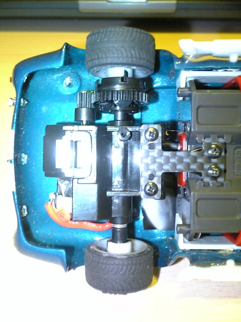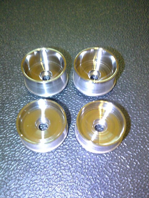 装着している物が旋盤でを削り出したものです 素材はチタン、加工機械が旋盤とボール盤しかないのでデサインはデッシュタイプ 実車でのマークⅠと言ったところですかね がいかんせん重過ぎかな、6畳間で走らせてみると加速が鈍くなってしまいました グリップ自体は上がっているようなので広いサーキットではどうかというところです リムが厚めなので軽量化の余地はまだ有るんですが・・・ |